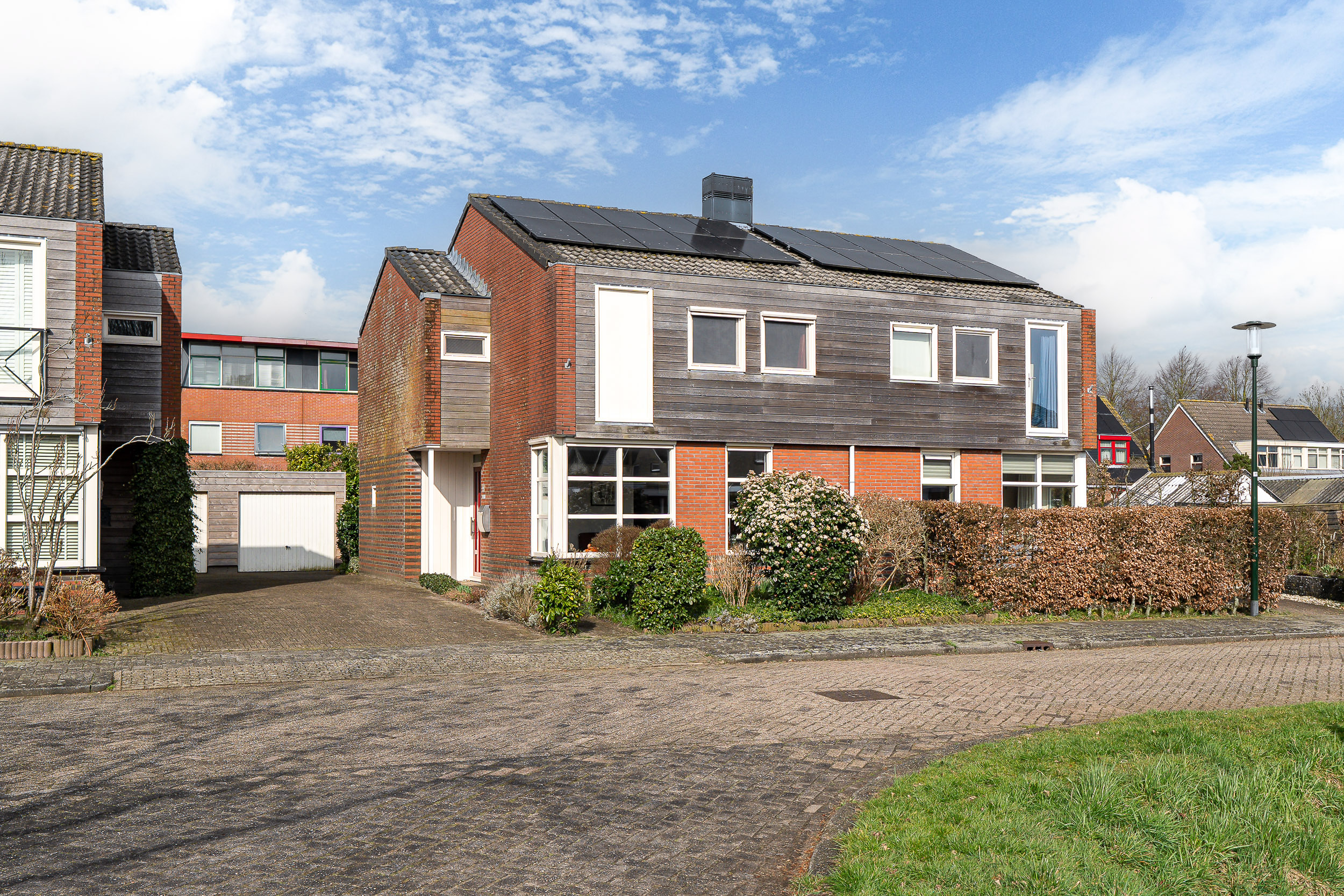 De woning beschikt over een gezamenlijke oprit met de buren en een vrijstaande garage met betonnen vloer en een duurzaam sedumdak. Tegelijk met dit dak is in april 2025 het houtwerk aan de buitenzijde van de garage vernieuwd, wat bijdraagt aan de verzorgde uitstraling.