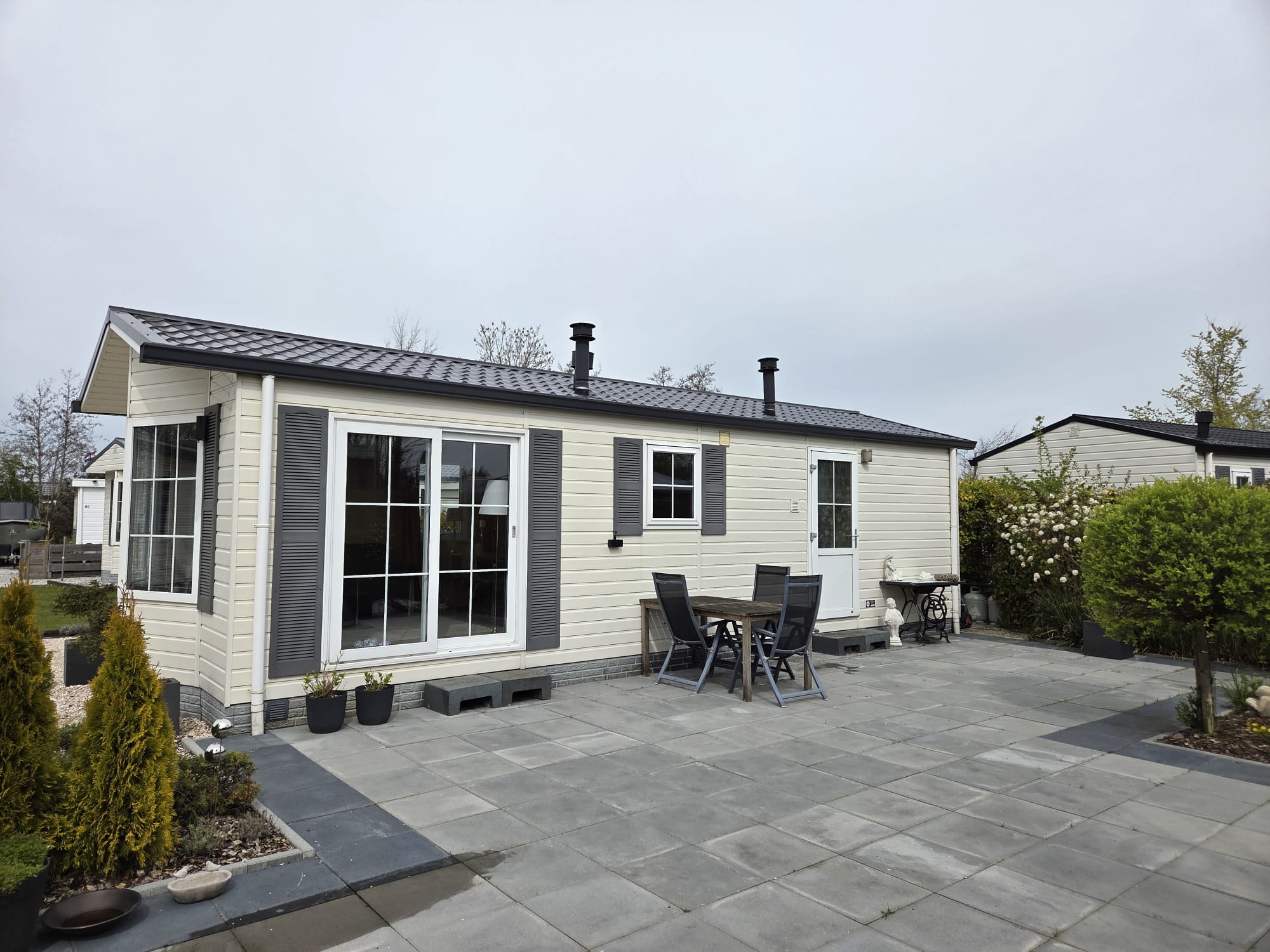 De ruime, onderhoudsvrije tuin ligt langs de zuidelijke lange zijde van het chalet, waardoor je op ieder moment van de dag een heerlijk zonnig plekje vindt – perfect voor lange, ontspannen dagen en avonden buiten.