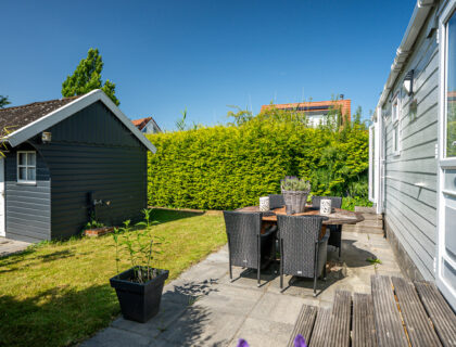 Vanuit het chalet bereik je via de openslaande deuren het ruime terras, waar je heerlijk van de zon geniet gedurende de dag. Daarnaast is er een beschutte loungehoek gerealiseerd, waar je de schaduw op kunt zoeken. Deze loungehoek vind je naast een vrijstaand houten berging/tuinhuis, die meer dan voldoende bergruimte biedt en waarin zich een extra toilet bevindt.